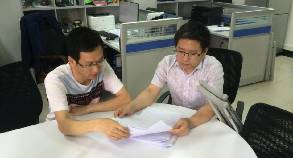 带伤工作的代方银(右一)与陈鹏博士讨论问题