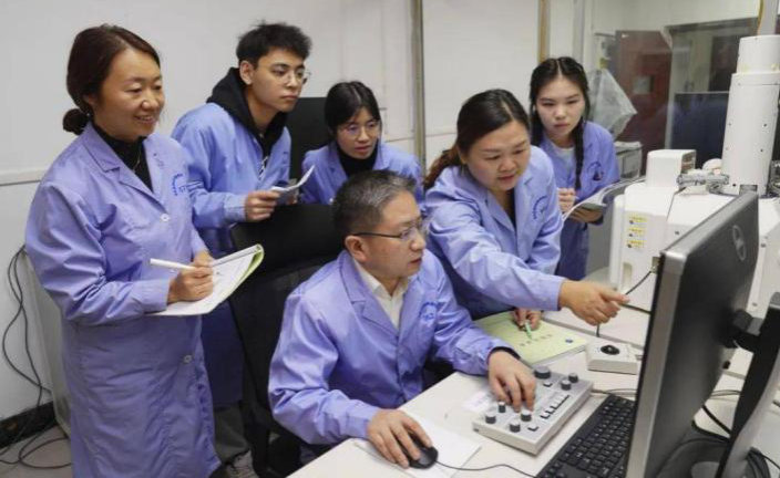 代方银(操作设备者)与团队成员分析实验结果